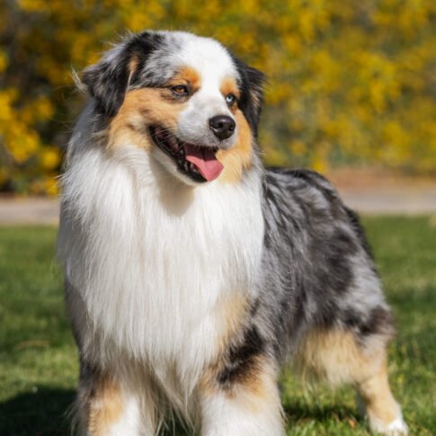 O blue merle apresenta manchas e padrões pretos sobre um fundo que varia do cinza-ardósia ao azul-claro. Pode também apresentar marcações brancas e/ou em tom de cobre.