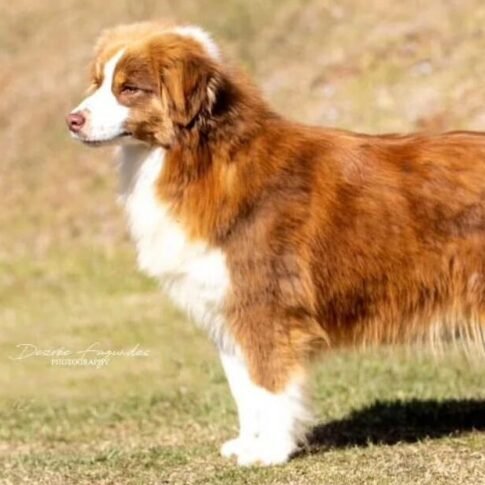 O red merle apresenta manchas e padrões vermelhos sobre um fundo creme. Pode também apresentar marcações brancas e/ou em tom de cobre.
